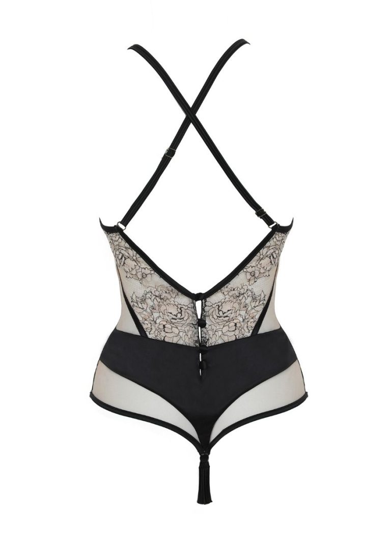 Laat je verleidelijke kant zien met Body Jasmine — een elegante body van satijn en doorzichtige stof met een subtiel bloemmotief. Het delicate transparante patroon speelt sensueel met je huid, terwijl het zachte satijn je rondingen omhult voor een luxueus second-skin effect.