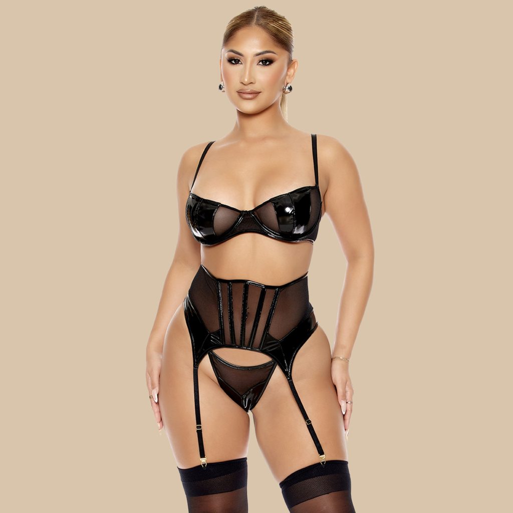 Domineer je look met Driedelige set Fiona, een stoere vinyl driedelige set die je rondingen strak accentueert en een onweerstaanbaar second-skin effect geeft. Perfect voor wie durft te verleiden.