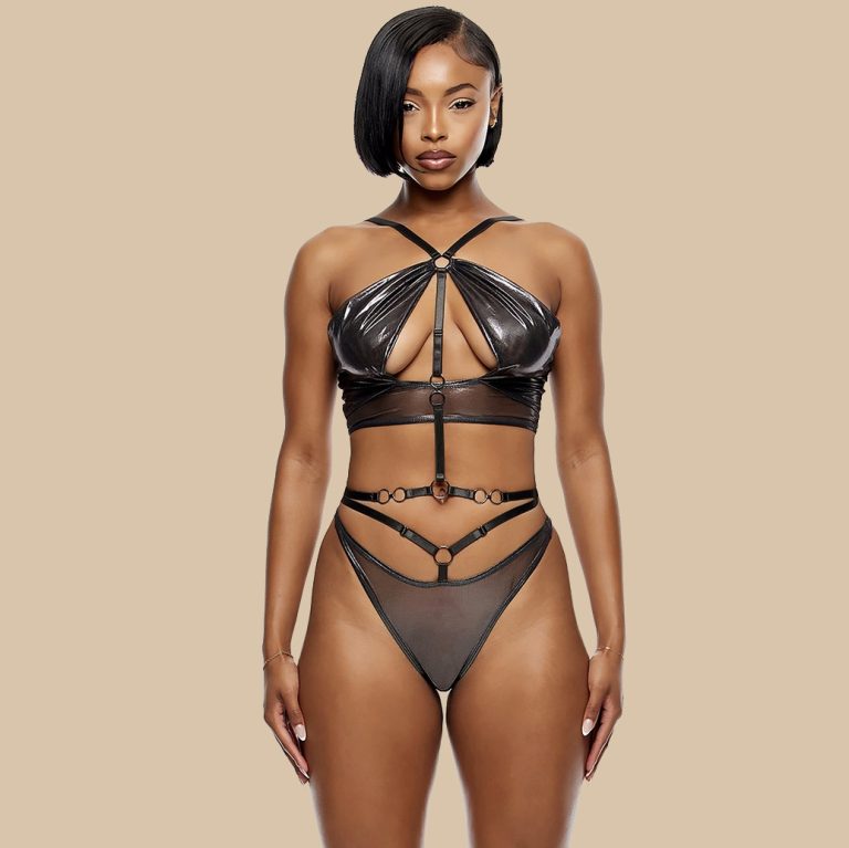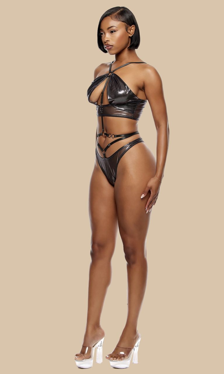 Durf te verleiden met Set Freya — een edgy, glanzende gunmetal set die kracht en sensualiteit perfect combineert.